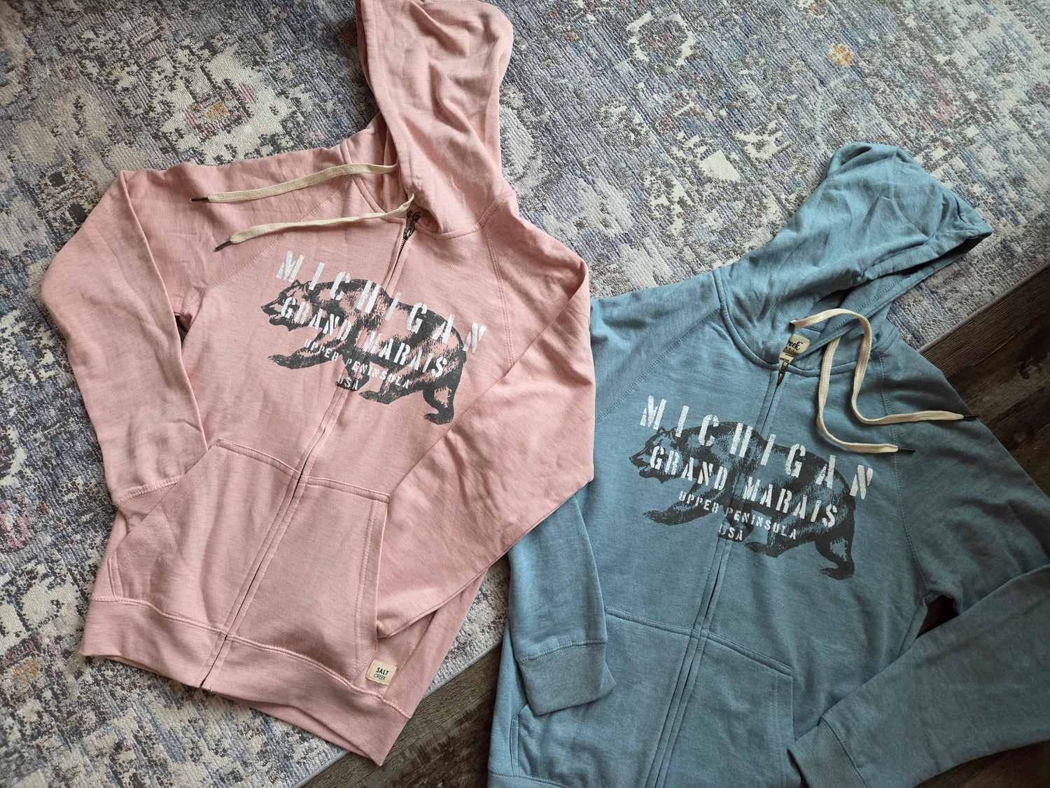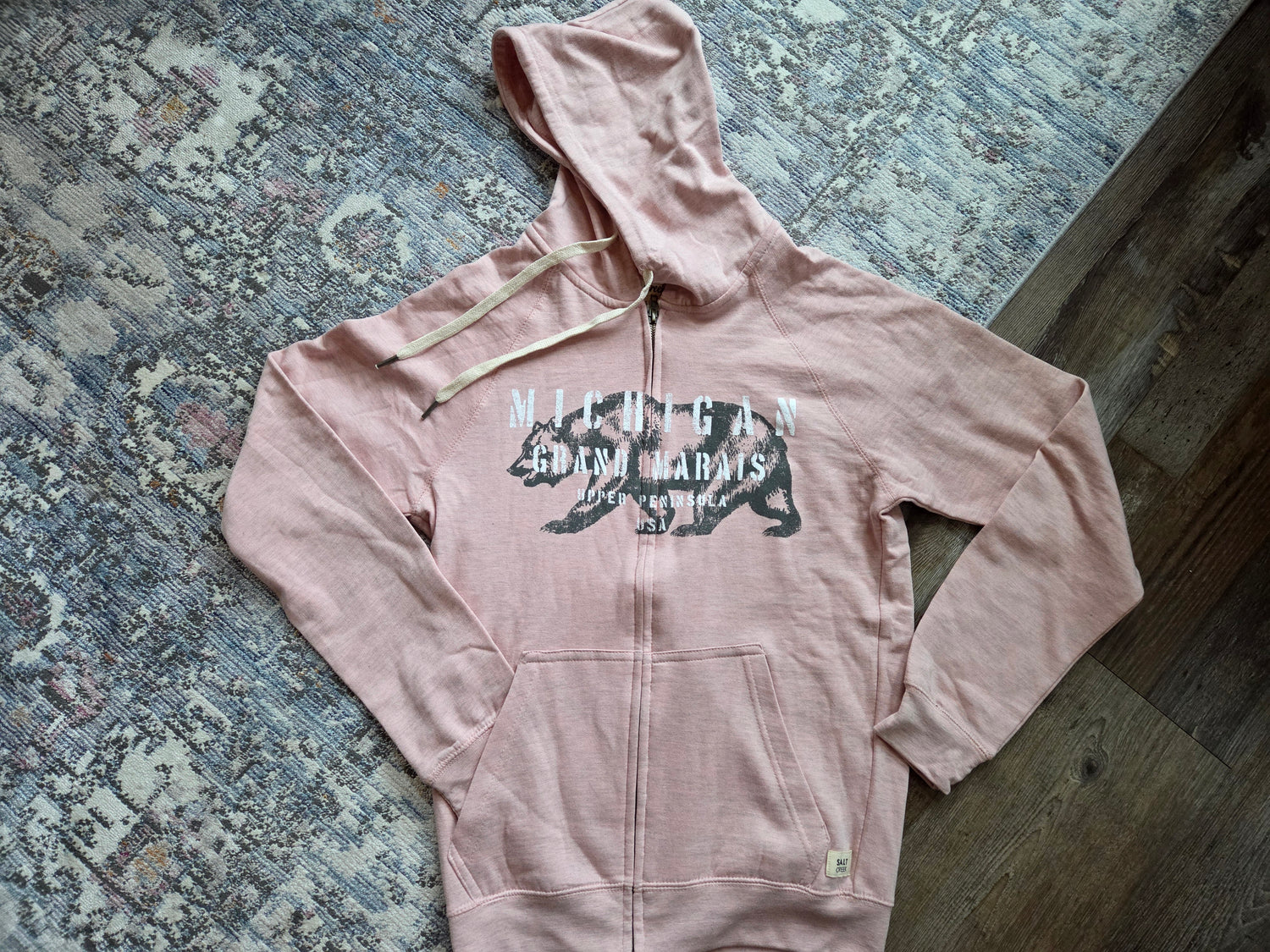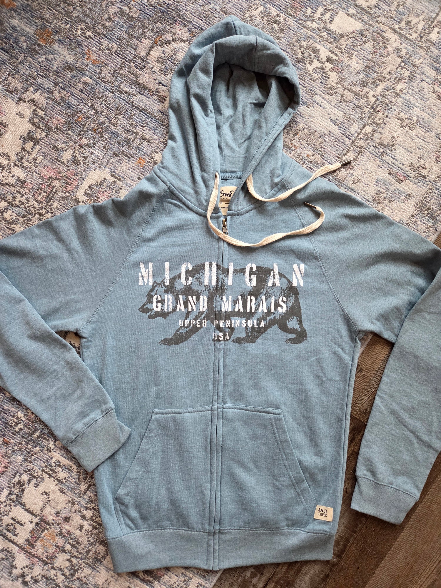 Chalk Talk is the name of the design on this Salt Creek brand hoodie and we couldn't be more impressed. 90% cotton and 10% polyester with a full zipper and 2 side pockets. Slate Blue color or Pink Rose. Kind of a heather grey mixed into the blue and pink. Design is full front. Lightweight hoodie, perfect for layering