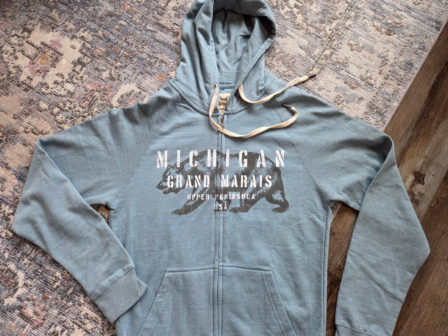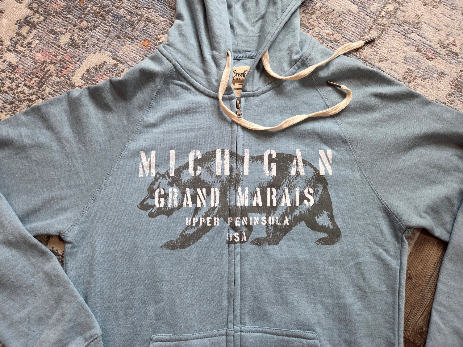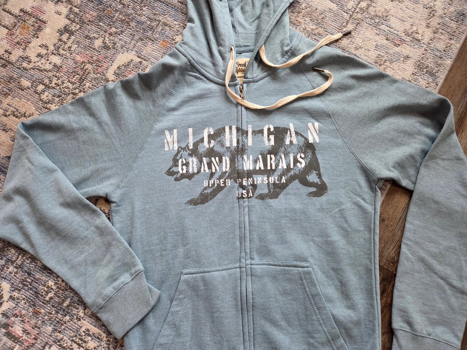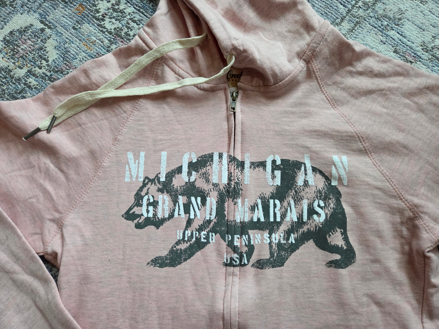 Chalk Talk is the name of the design on this Salt Creek brand hoodie and we couldn't be more impressed. 90% cotton and 10% polyester with a full zipper and 2 side pockets. Slate Blue color or Pink Rose. Kind of a heather grey mixed into the blue and pink. Design is full front. Lightweight hoodie, perfect for layering