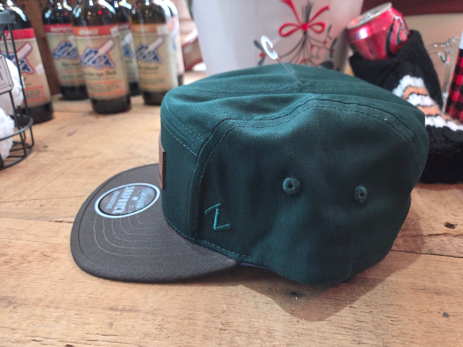 Zephyr brand flat bill snap back hat with Grand Marais patch in front. Emerald green color, unique panel shape that is a favorite!