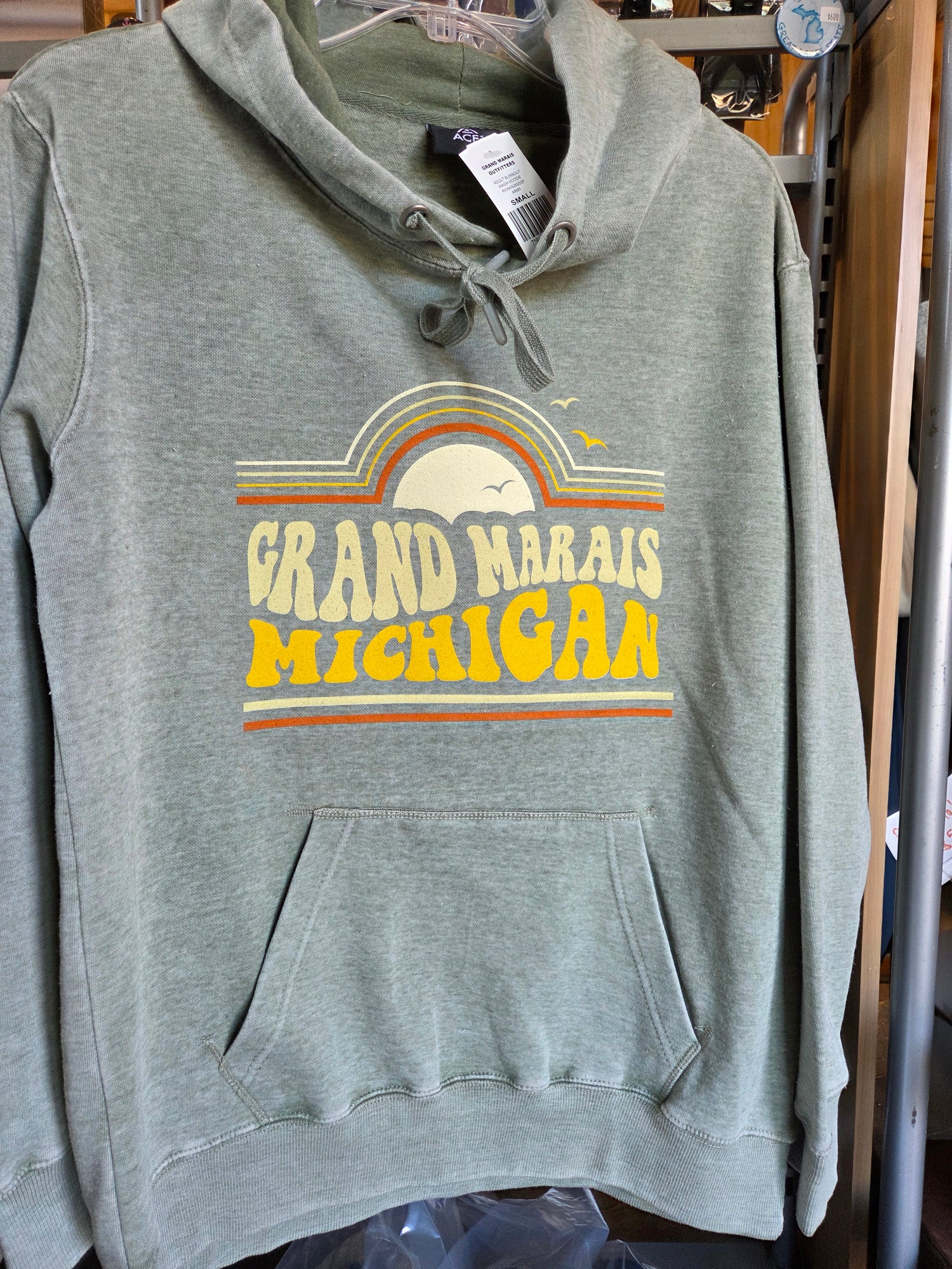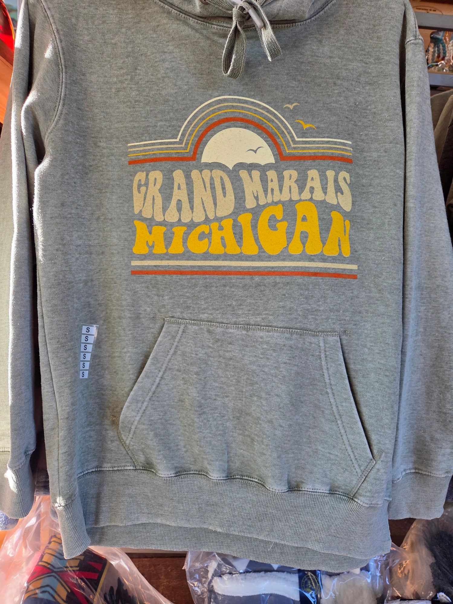 What a groovy design on this adult burnout wash hoodie. 52% cotton and 48% polyester, Soft and medium weight. Smoke color is a gray - blue and army color is a green - gray. The burnout wash gives it a unique look.