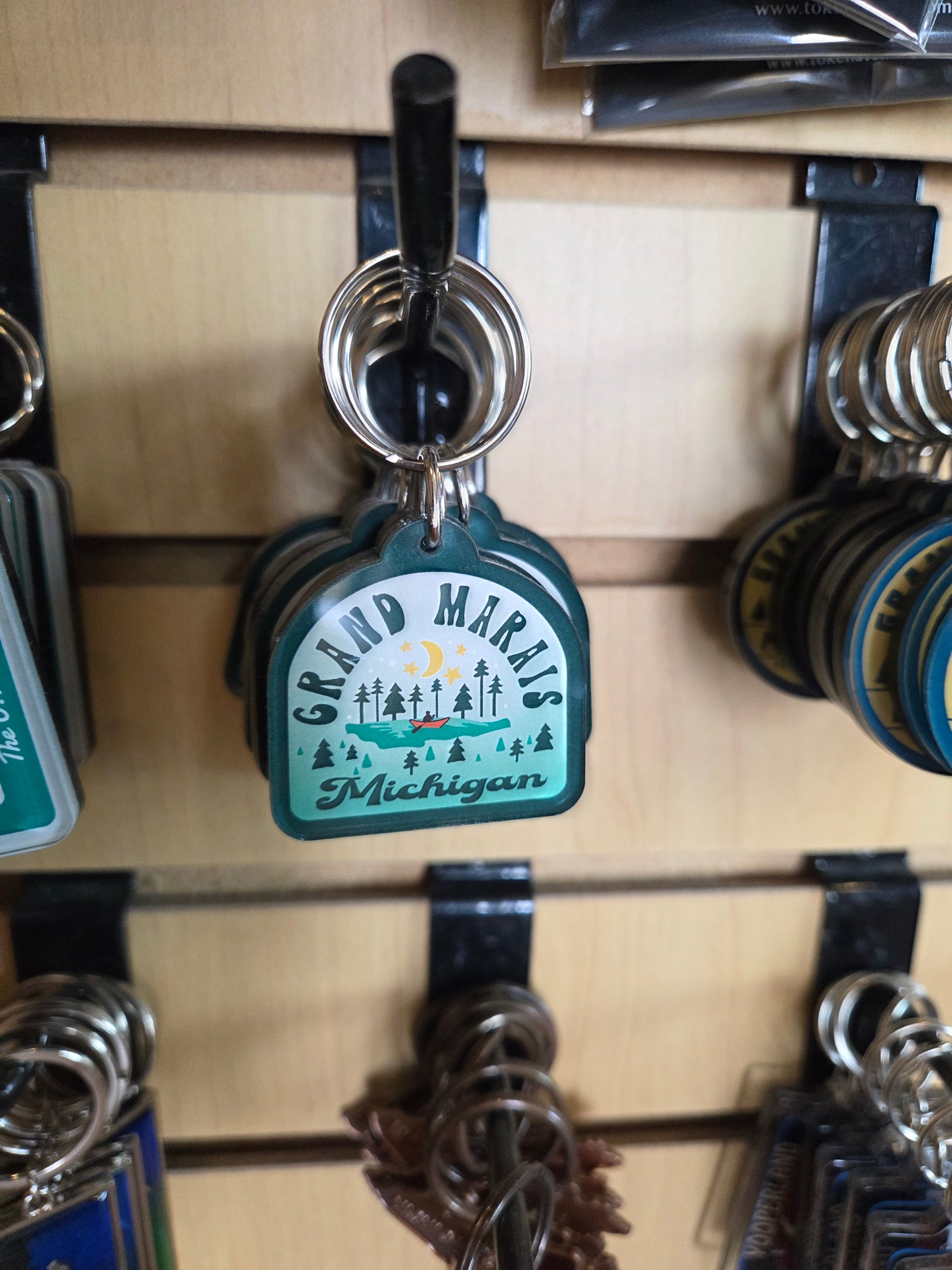 Show your Grand Marais pride with these beautiful and durable keychains! Approximately 2 inches across and 2 inches high. Sturdy with some of our favorite designs. Keep the keys to the cabin easily identifiable, or just tell everyone about your favorite place with your ring of keys
