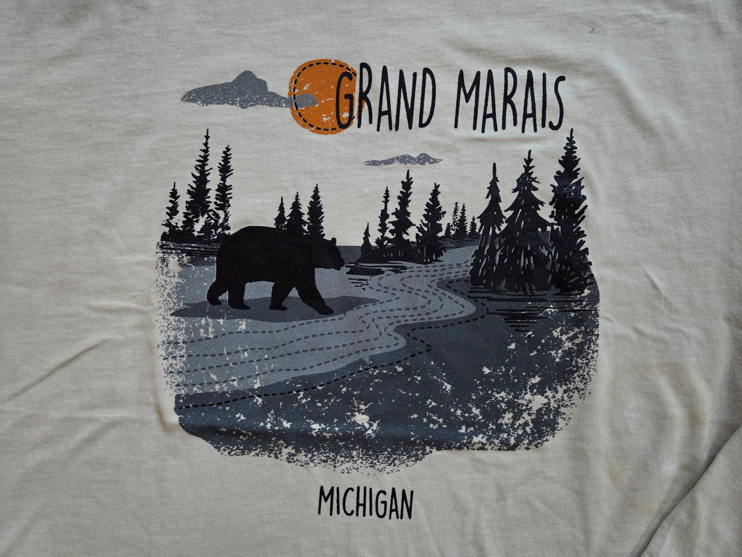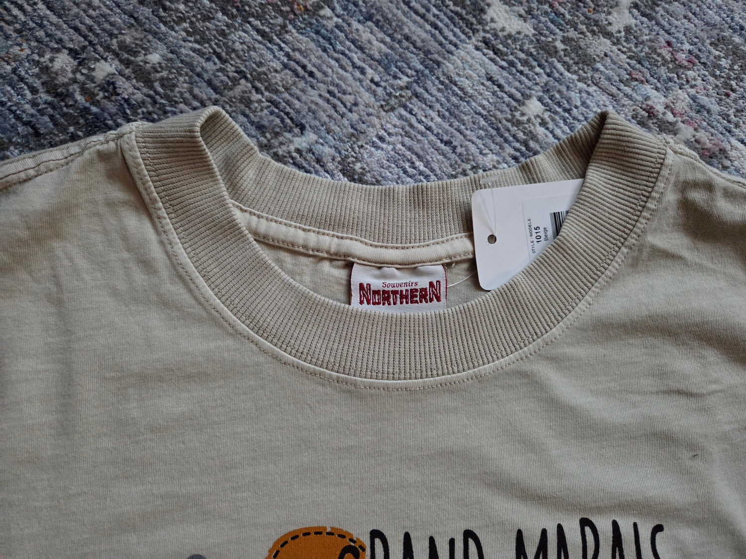 Very comfortable 100 percent cotton long sleeve shirt. No pockets, zippers or snaps. wide ribbing at neck and sleeves. Nice tan / beige color with creative design. Northern Souvenirs brand