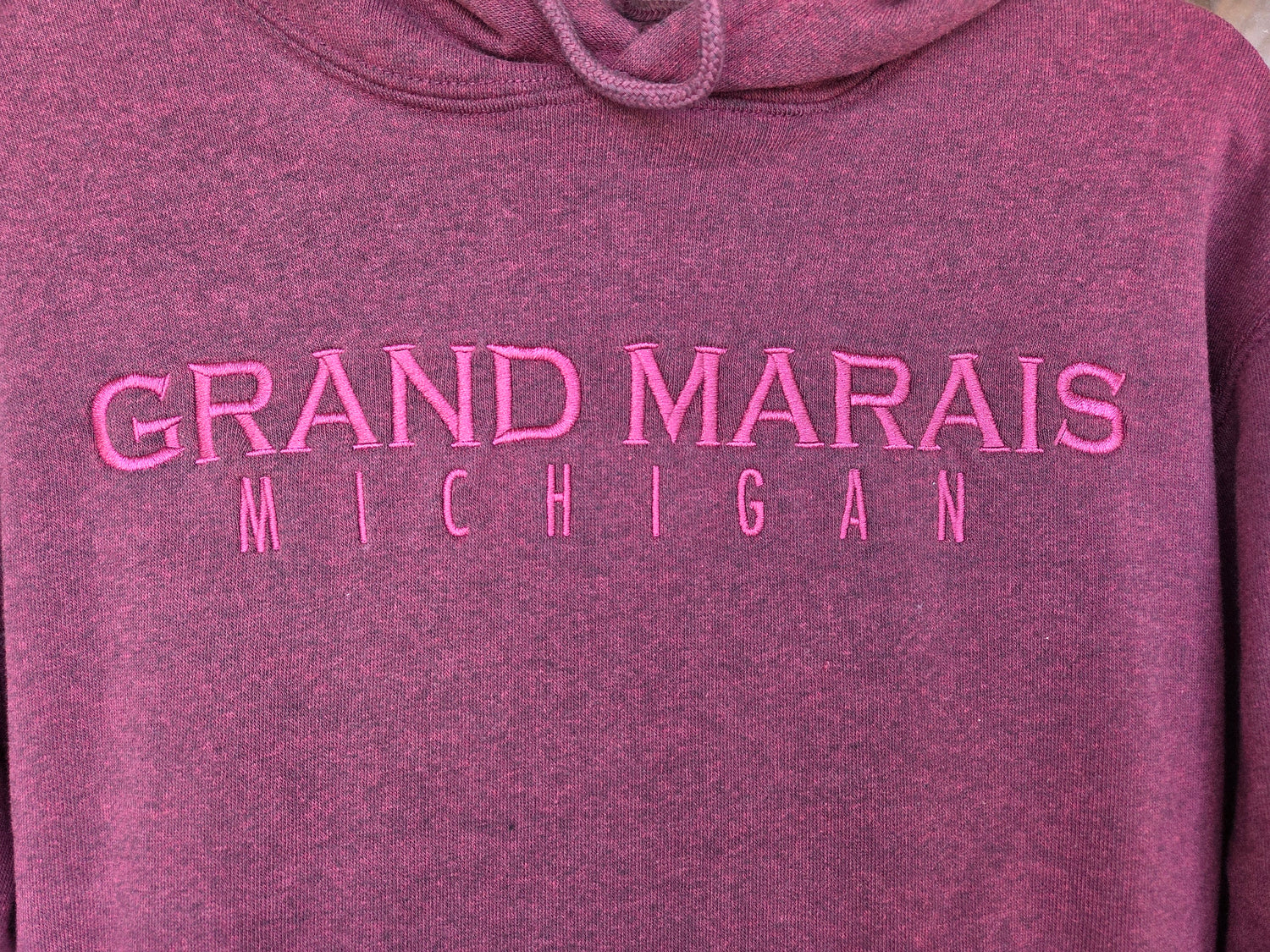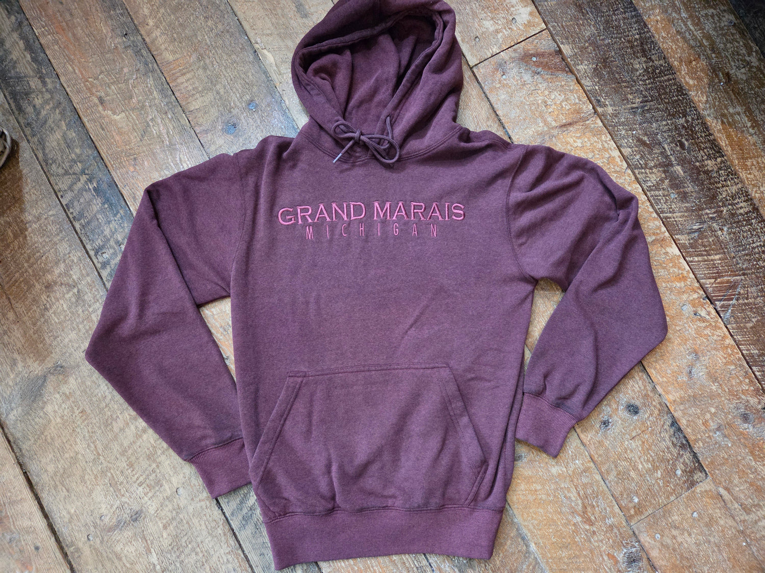Luxuriously soft hoodie with words Grand Marais Michigan. Oil washed makes this unique color and enhances the fabric softness. Maroon / burgundy wine colored, with complimenting thread for embroidered letters. Valani brand 55 cotton, 45 polyester. Unisex cut. machine wash cold. suggested to hand dry to maintain softness.