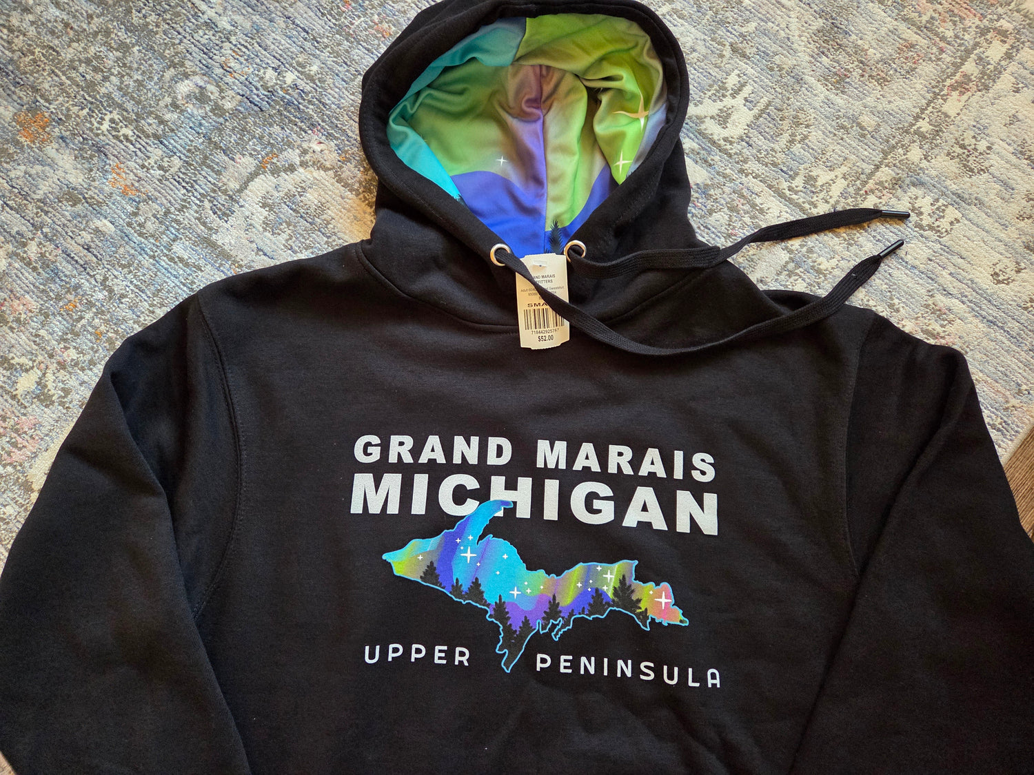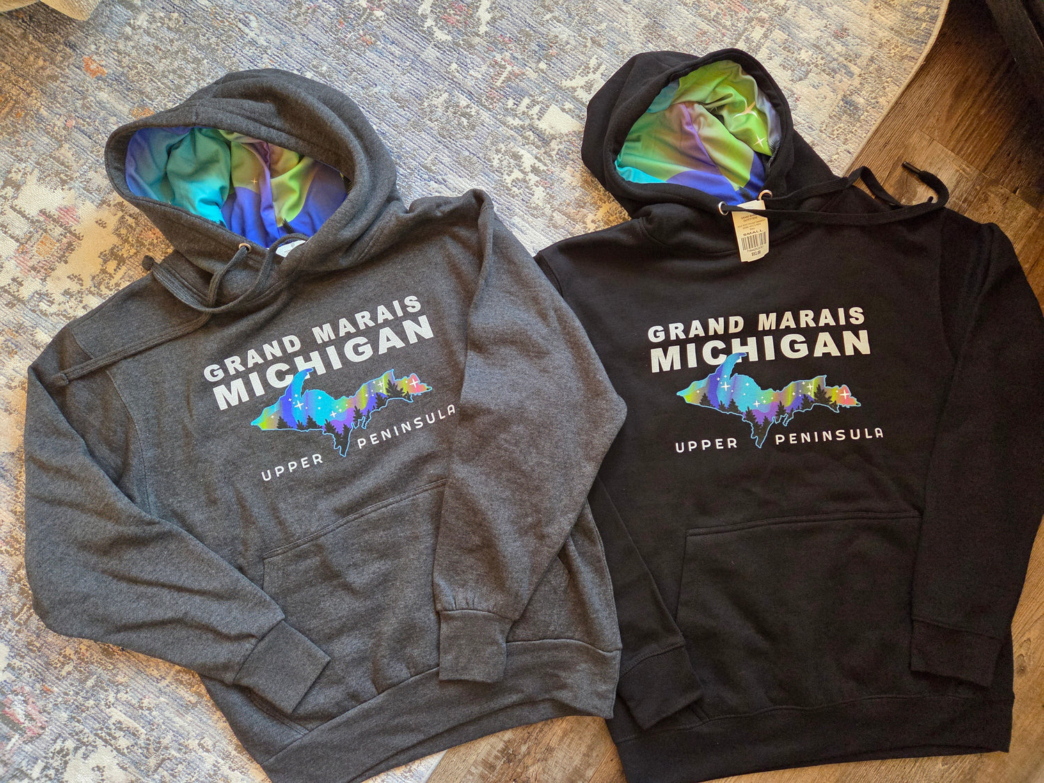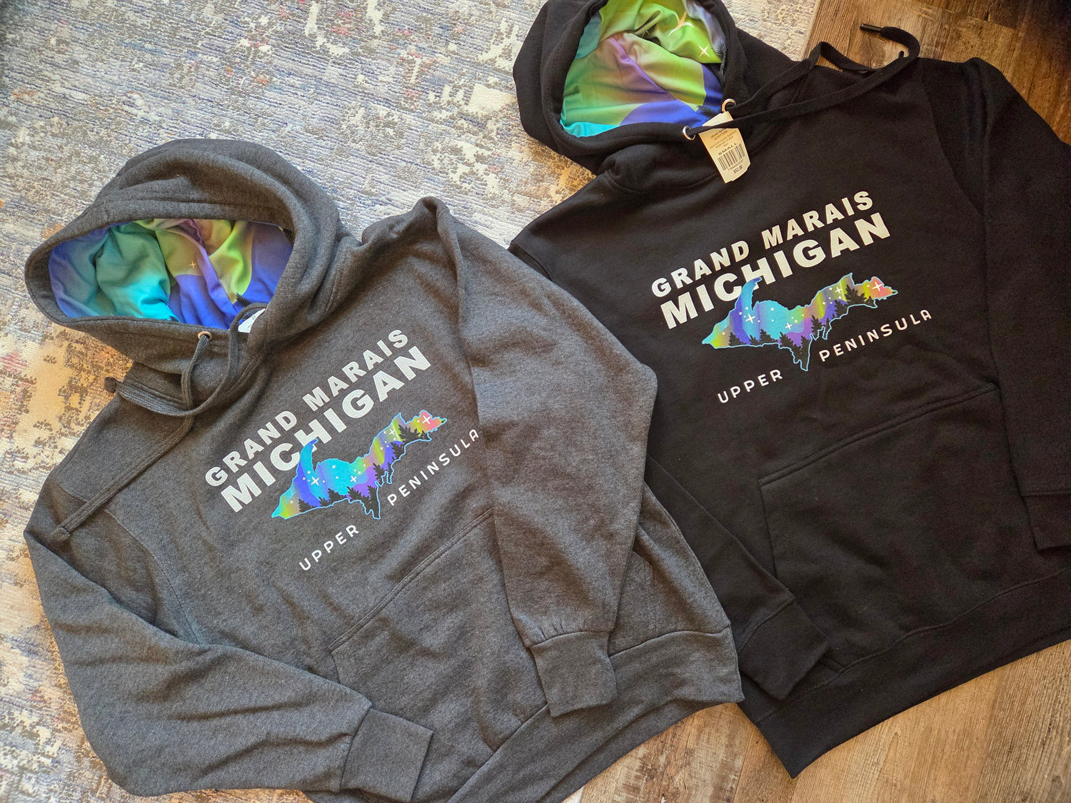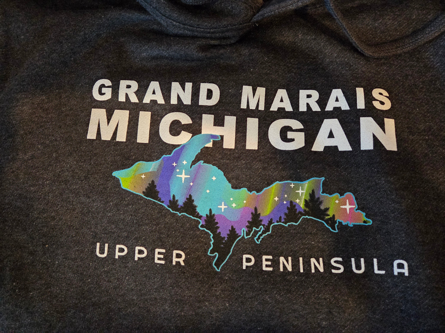 Who doesn't dream of viewing the aurora in Grand Marais? And if you have, count yourself lucky! With this cool hoodie you can see them all year round inside the hood as well as on the front. Either black or charcoal heather gray. US basics brand hoodie, made by ACE USA. 60% cotton 40% polyester. No zippers or pockets.