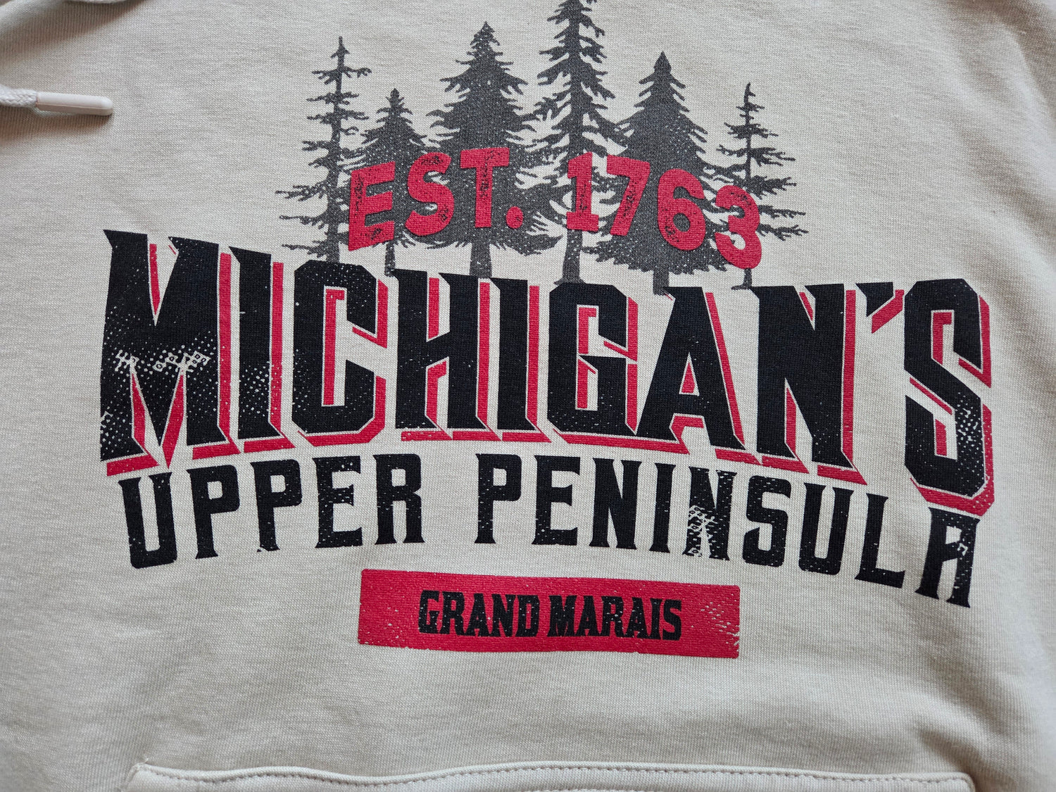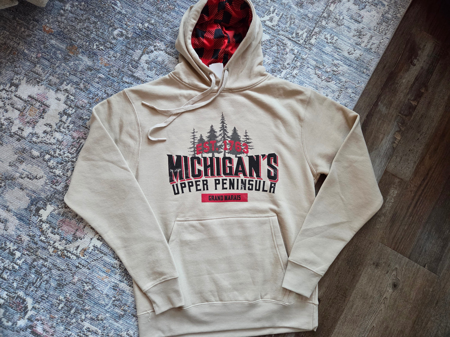 Super soft Oatmeal colored hoodie with plaid inside hood. Ace brand. 60% cotton and 40% soft polyester. It's a thick hoodie, but a soft blend so it's not too dense or heavy. Design is embroidered. No zippers